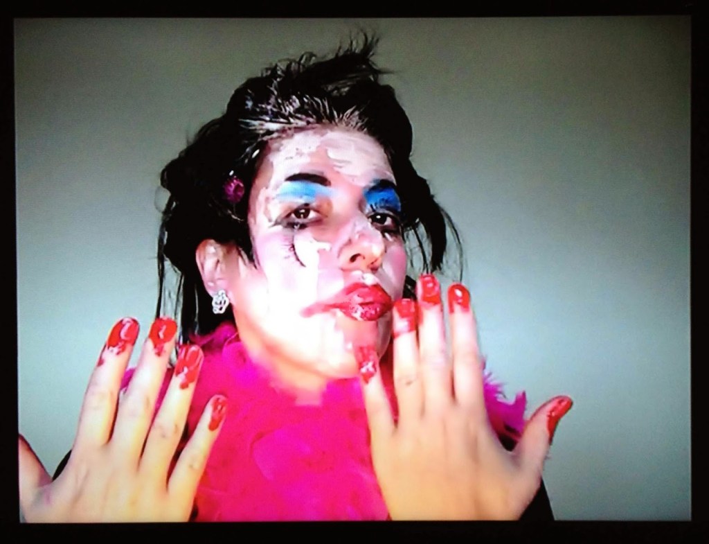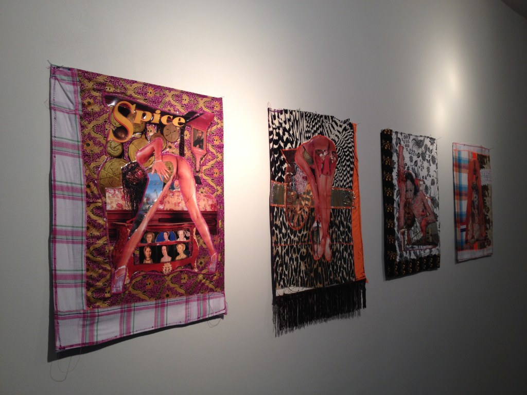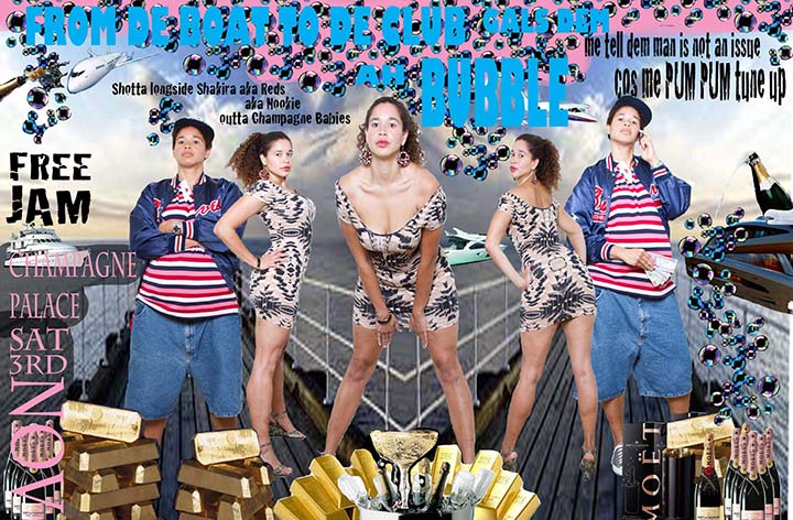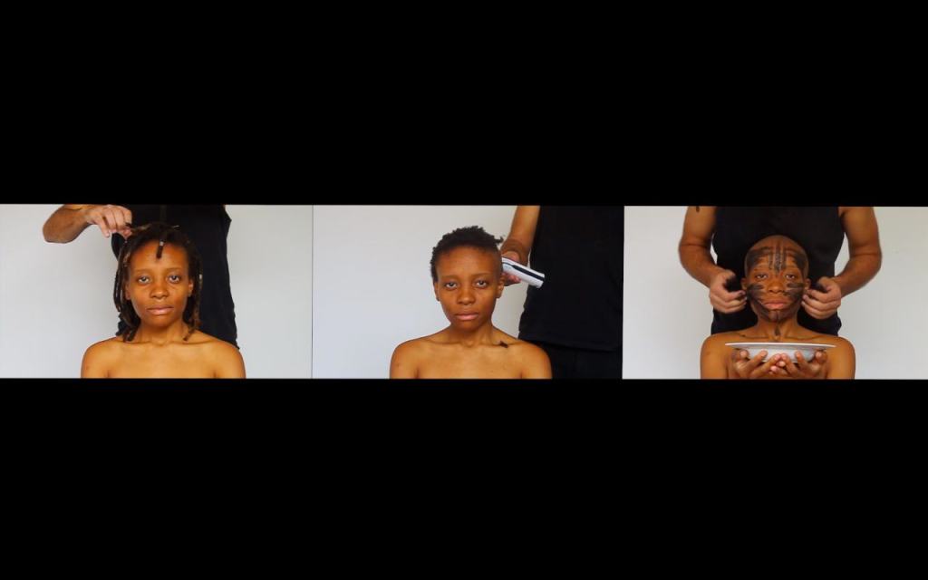 Presented in the exhibition are mixed media works by Amsterdam-based artist Patricia Kaersenhout positing the black female body between absence and pornography leading to Jeannette Elhers’ video The Invisible Empire (2010) addressing modern slavery and human trafficking. Looking at body aesthetics, Hélène Jayet and Lisa Hilli address the stigma and beauty of Afro hair. Ope Lori’s video Deracination (2010) critiques a strand of Black British music videos in which black female bodies are replaced by white ones, while Cecilia Ferreira’s tragicomic disfigured Belle (2014) derides the pressure put on women to conform to mainstream beauty canons. The healing nature of self-portraiture associated to cathartic rituals is conveyed in Ferreira’s Chaos Within (2009) and Euridice Kala’s Unlike Other Santas… (2013). Evan Ifekoya’s video and performative multimedia pieces See Learn Teach (2012) and The Gender Song (2014) challenge notions of cisnormativity and gender roles. In her Dancehall posters series, Alberta Whittle performs both genders with stereotyped over sexualised female figures and hyper-masculinity. Finally, Shigeyuki Kihara’s triptych Fa’a fafine: In the Manner of a Woman (2004-05) both evokes the voyeuristic nature of ethnographic photography and asserts her third gender identity – an identity traditionally accepted in cultures from the Pacific.